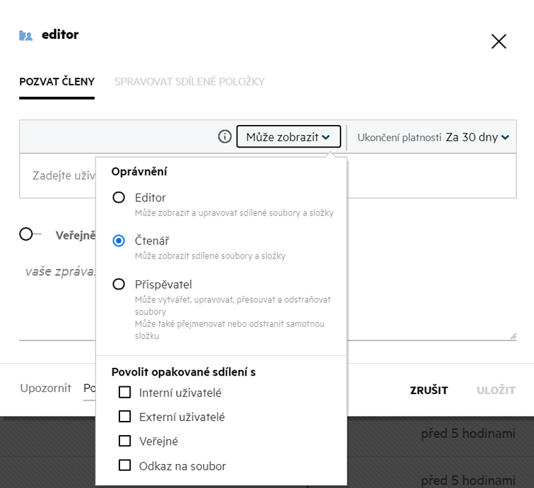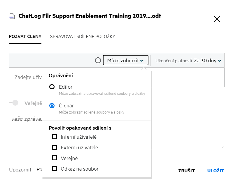 Interní uživatelé: Soubor lze opakovaně sdílet s interními uživateli.