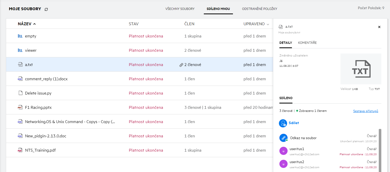 Zobrazí se podrobnosti o uživatelích a skupinách a o stavu vypršení platnosti sdílení.