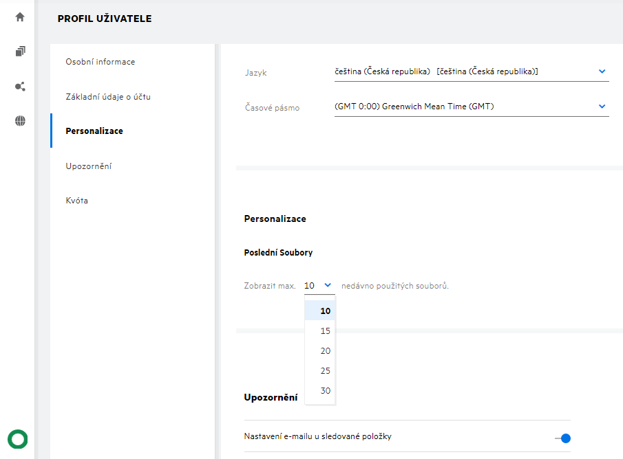 Počet souborů, které mají být zobrazeny v části Poslední soubory, lze konfigurovat. Chcete-li toto nastavení nakonfigurovat, přejděte do svého Profilu uživatele.