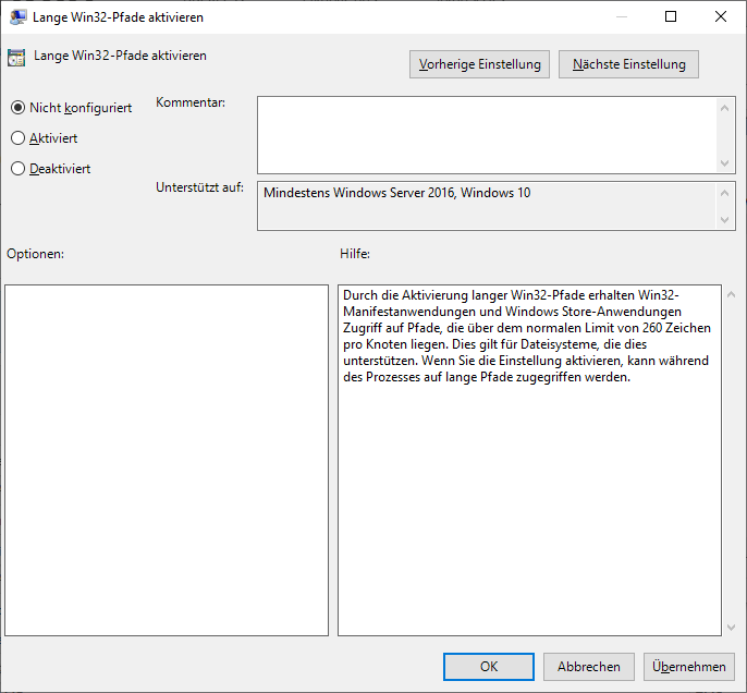 Doppelklicken Sie auf Lange Win32-Pfade aktivieren.