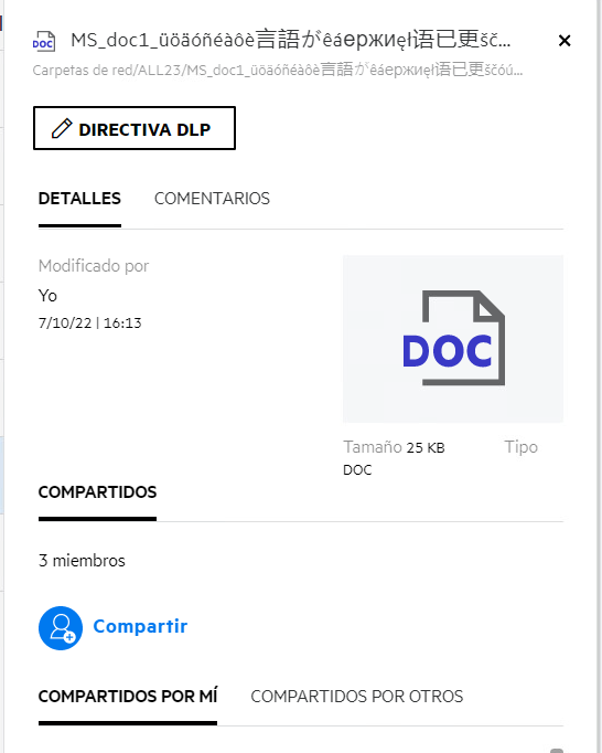 Si se habilitado la función DLP y se aplica una directiva en el nivel de carpeta de red, el nombre de la directiva DLP aparecerá sobre la pestaña Detalles. El nombre de la directiva es de solo lectura y no se puede editar.