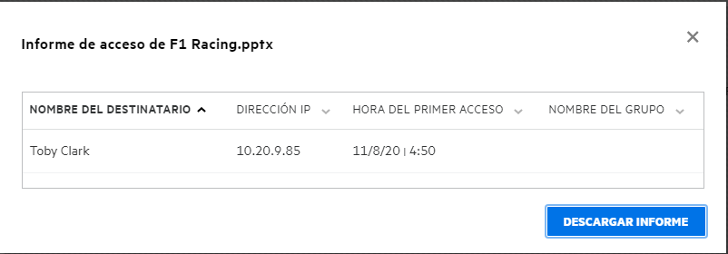 El informe incluye información de acceso de los destinatarios, como quién accedió al archivo, la dirección IP del equipo con el que se accedió a este, y la fecha y la hora del acceso al archivo. Puede descargar una versión en formato PDF del informe. Para ello, haga clic en Descargar informe.