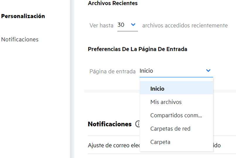 La página de inicio es la página de entrada por defecto y se pueden personalizar. Puede definir las áreas de trabajo de Filr (excepto Público) o la carpeta de las áreas de trabajo como página de entrada. Tras la configuración, al entrar a Filr, accederá a la carpeta o el área de trabajo definidas como página de entrada por defecto. Lleve a cabo los pasos siguientes para definir las preferencias de la página de entrada: