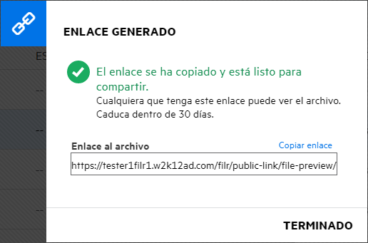 La opción Compartir enlace se utiliza para generar un enlace para compartir un archivo o una carpeta. Un usuario con el enlace puede acceder al archivo compartido sin necesidad de autenticarse. El usuario puede ver o descargar un archivo, pero no puede moverlo, editarlo ni suprimirlo. Puede generar un enlace para: