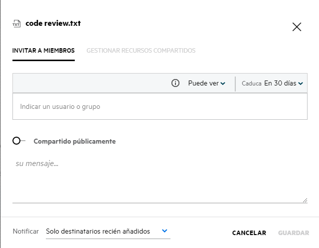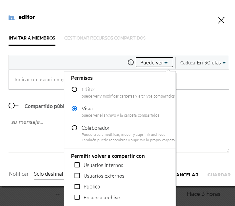 Al compartir varios archivos o carpetas, si un archivo tiene derechos de visualización y una carpeta tiene derechos de colaborador, se tendrán en cuenta los derechos de visualización. Puede editar los permisos de uso compartido mediante la opción Gestionar recursos compartidos del menú Más accionesde un archivo. En el cuadro de diálogo Gestionar recursos compartidos, en Gestionar recursos compartidos, seleccione el nombre de usuario o grupo y, a continuación, haga clic en