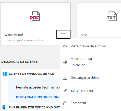 NOTA:Esta opción se muestra cuando tiene permisos de colaborador en la carpeta o en las áreas de trabajo de Filr.