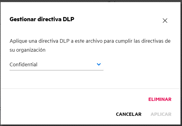 Si se ha habilitado la función DLP y no se aplica una directiva en el nivel de carpeta de red, el botón Directiva DLP aparecerá sobre la pestaña Detalles. Puede hacer clic en este botón, seleccionar una directiva y aplicarla al archivo.
