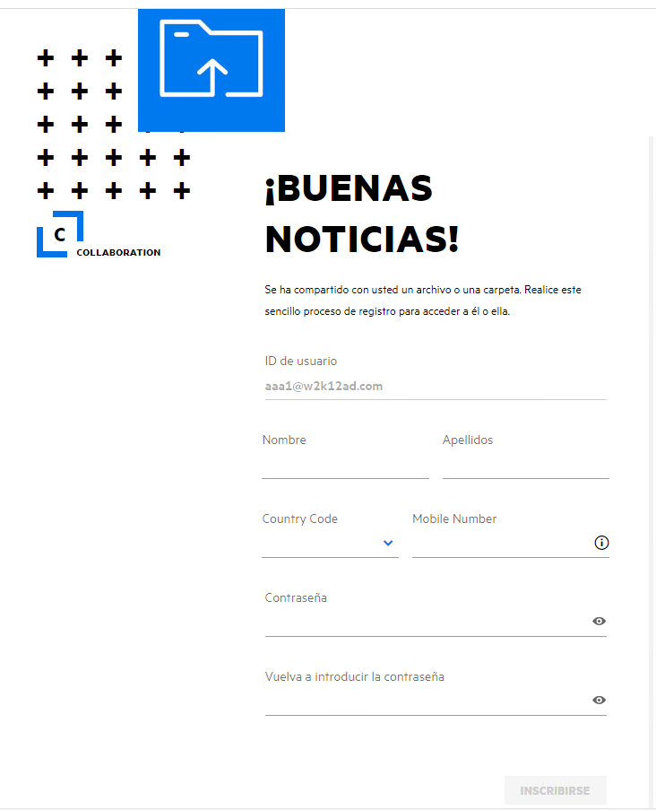 Cuando se comparte un archivo con un usuario externo, este tiene que entrar a la aplicación Filr para acceder al archivo. Cuando se comparte el archivo, se envía un mensaje de correo electrónico al usuario externo con el enlace a un formulario de autorregistro. El usuario debe introducir los datos en el formulario y completar el proceso de autorregistro para poder entrar a la aplicación Filr. El formulario presenta el siguiente aspecto:
