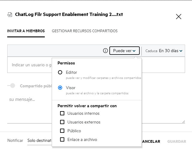 Aquí puede cambiar los permisos de uso compartido y la caducidad del recurso compartido. Al hacer clic en la opción Restablecer, se restablecerán los cambios realizados en la configuración de permisos anterior.