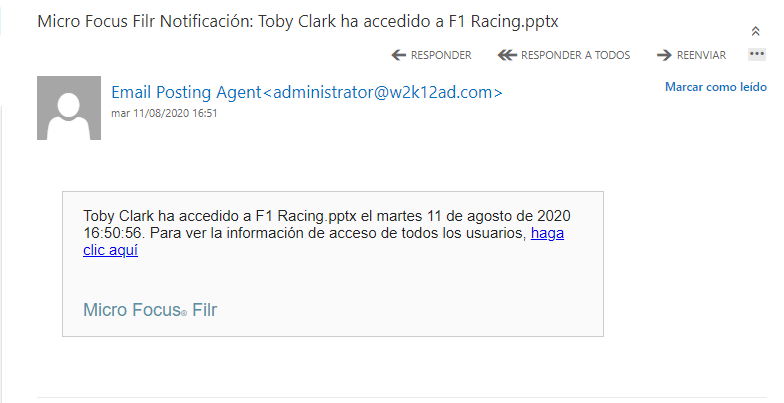 El informe de acceso compartido proporciona detalles acerca de un archivo como, por ejemplo, quién ha accedido a él y en qué momento, y si se han añadido comentarios al archivo. El informe de acceso compartido solo está disponible en Filr Advanced. Si un receptor accede al archivo compartido, recibirá un mensaje de correo electrónico de notificación de Filr. Para ver el informe de acceso, también puede hacer clic en el enlace que se proporciona en el mensaje de correo electrónico; a continuación, se le enviará a la información del receptor. Si el receptor ha accedido al archivo compartido, se muestra la opción El informe de acceso está disponible del menú Más acciones.