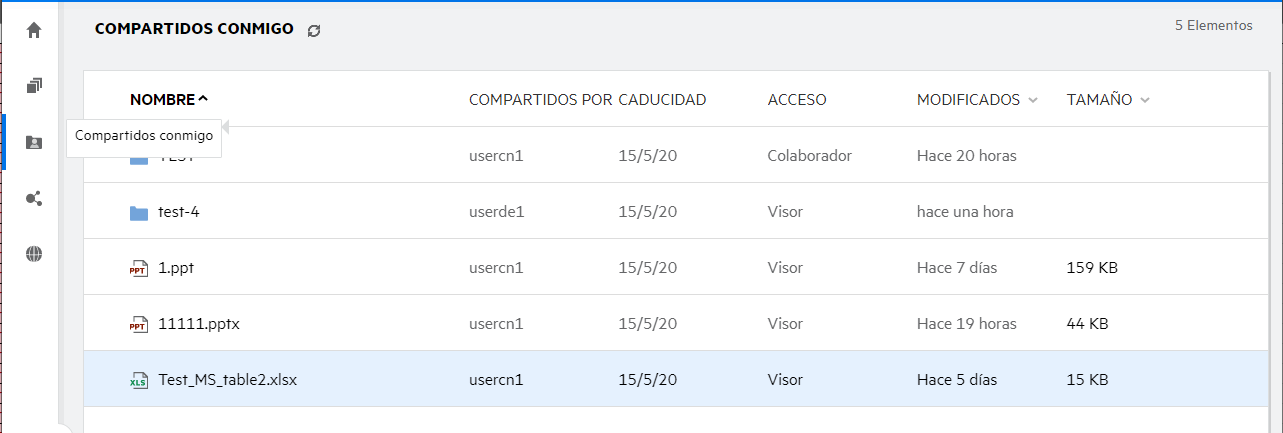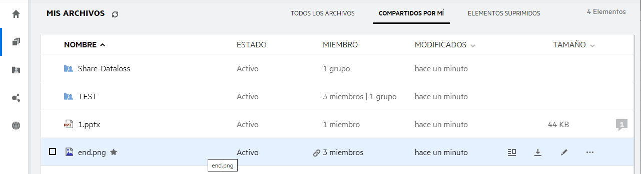 Al compartir un archivo, la columna Miembros del área Mis archivosse actualiza con el número de miembros o grupos con los que se comparte el archivo. Todos los archivos compartidos se muestran también en COMPARTIDOS POR MÍ, en las áreas correspondientes. Si se han compartido archivos con usted, estos aparecen en el área COMPARTIDOS CONMIGO. También puede hacer clic en el botón