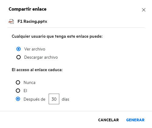 Seleccione el tipo de enlace que desea generar y establezca la configuración de caducidad del enlace. Haga clic en GENERAR.