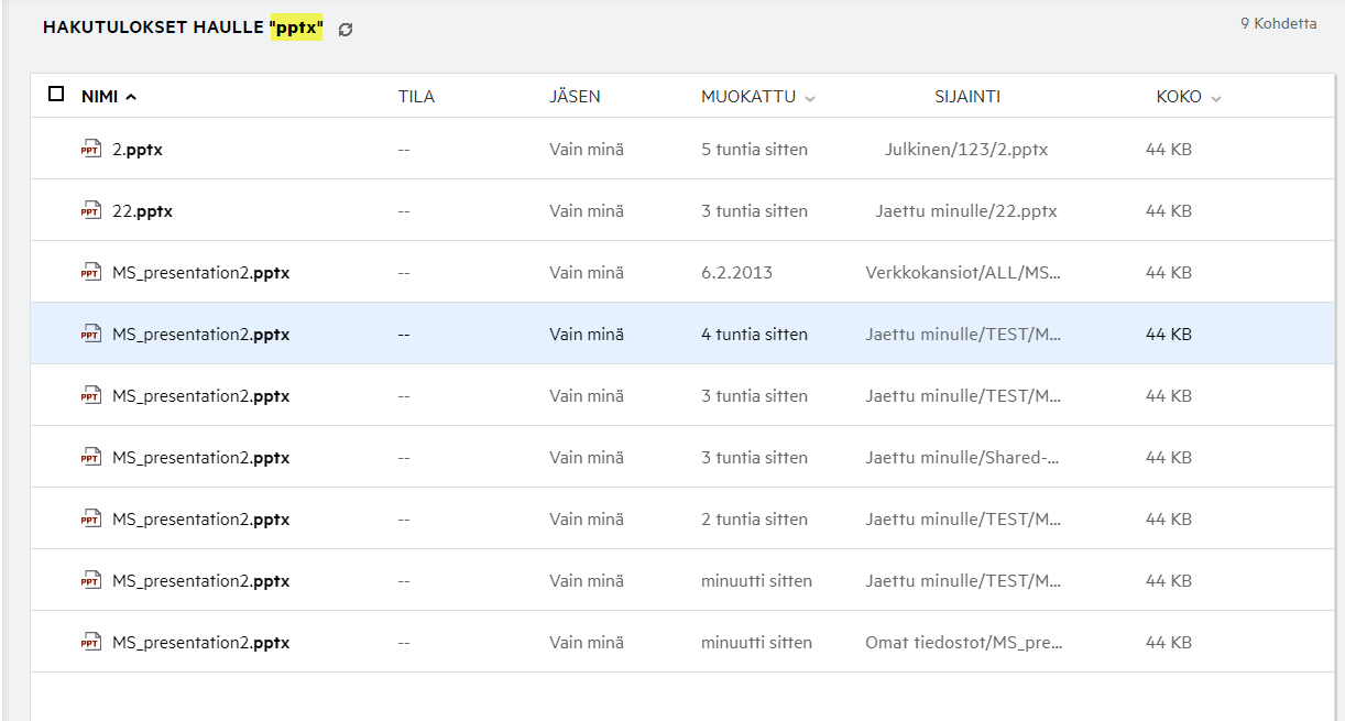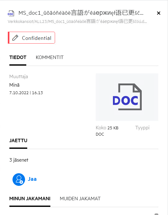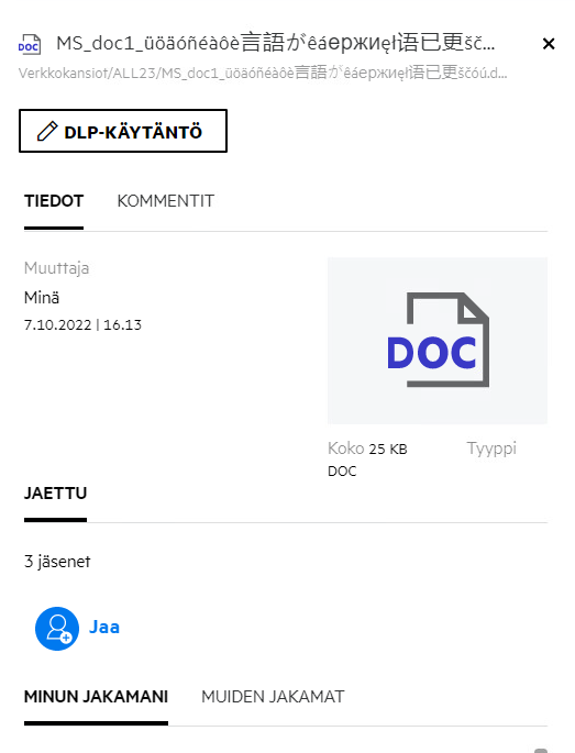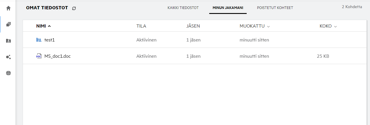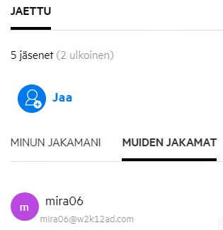 Tiedostoa jakaessa Jäsenet-sarake Omat tiedostot -alueella päivittyy ja näyttää kuinka monelle jäsenelle tai ryhmälle tiedosto on jaettu. Kaikki jakamasi tiedostot luetteloidaan myös MINUN JAKAMANI -kohdassa omilla alueillaan. Jos sinulle on jaettu tiedostoja, tiedostot näytetään JAETTU MINULLE -alueella. Voit myös napsauttaa