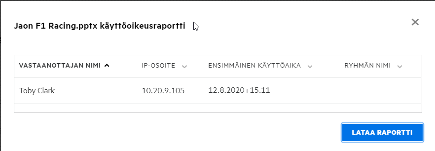 Raportti sisältää käyttötietoja vastaanottajista, kuten kuka käytti tiedostoa, laitteen IP-osoite, josta tiedostoa käytettiin ja tiedoston käyttöpäivämäärä ja kellonaika. Voit ladata PDF-version raportista napsauttamalla Lataa raportti.