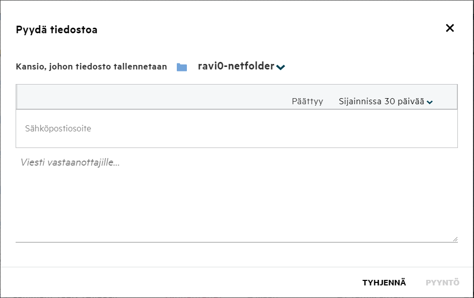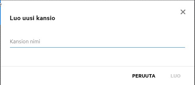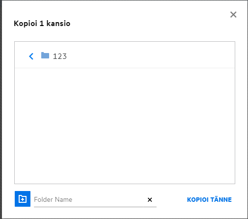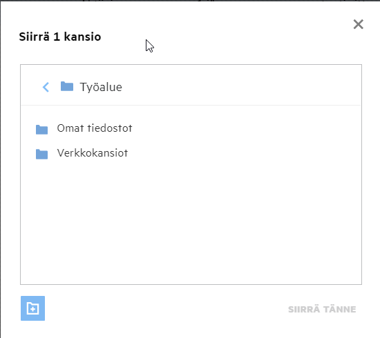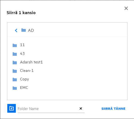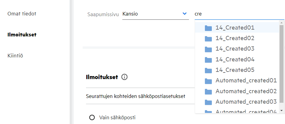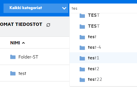 Kun valitset Kansio-vaihtoehdon, Hae kansioista -kenttä näytetään. Kirjoita kansion nimi tai nimen kolme ensimmäistä merkkiä. Kaikki kansiot, joiden nimi täsmää hakukenttään kirjoitetun tekstin kanssa, ovat valittavissa luettelossa. Luettelossa on kaikki kansiot Filrin työalueilta, joihin sinulla on käyttöoikeus (Omat tiedostot, Jaettu minulle ja Verkkokansiot. Pidä kursoria kansion nimen kohdalla nähdäksesi kansion koko polun.
