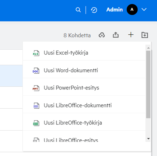 Voit nyt muokata mukautettuja malleja tai luoda uusia tiedostoja Filrissä. Luo uusi tiedosto -vaihtoehto on saatavilla vain Advanced Filr Edition -versiossa, ja järjestelmänvalvojan tulee ottaa Content Editor käyttöön. Omat tiedostot- ja Verkkokansiot-alueilla ominaisuutta voi käyttää juurikansiossa ja kansiotasolla, Jaettu minulle- ja Minun jakamani -alueilla se on käytettävissä vain kansiotasolla.