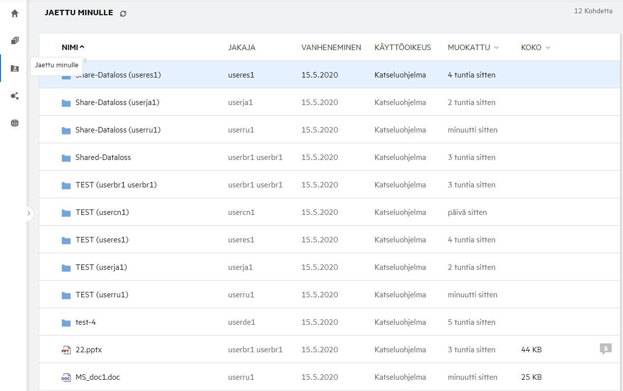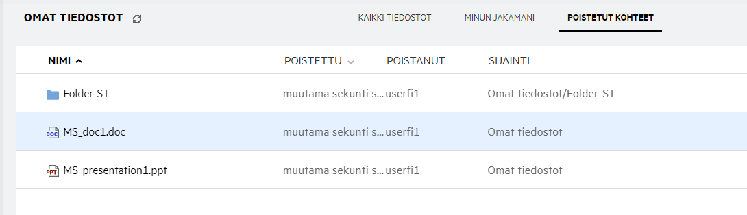 Kirjautunut käyttäjä näkee Viimeisimmät tiedostot -luettelossa viimeksi käytetyt tiedostot. Jos tiedosto on jaettu, vain tiedoston omistaja ja vastaanottaja näkevät tiedoston Viimeisimmät tiedostot -luettelossa. Esimerkiksi: Käyttäjä A (omistaja) jakaa tiedoston käyttäjälle B. Tiedosto näytetään käyttäjä A:n ja käyttäjä B:n Viimeisimmät tiedostot -luetteloissa. Muutaman päivän kuluttua käyttäjä A jakaa saman tiedoston käyttäjälle C, jolloin jaettu tiedosto näytetään käyttäjä A:n ja käyttäjä C:n Viimeisimmät tiedostot -luettelossa.