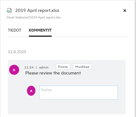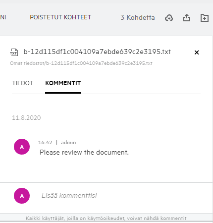 Näyttää tiedostot ja kansiot, jotka olet poistanut. Filrissä voit hakea tiedostoja tai kansioita roskakorista ja palauttaa ne edelliseen sijaintipaikkaansa. Kun palautat tiedoston, palautetaan myös kaikki siihen liittyvät kommentit.