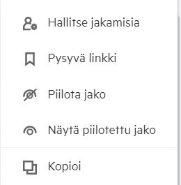 Luodaksesi linkin napsauta tiedostoa/kansiota hiiren kakkospainikkeella ja valitse Jakolinkki tai valitse vaihtoehto tiedoston Lisää toimintoja -valikosta.