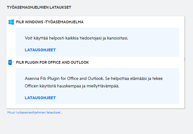 TYÖASEMAOHJELMIEN LATAUKSET: Tietoja Filr-työasemaohjelmasta, latauslinkit muihin Filr-ohjelmiin sekä Office- ja Outlook-lisäosiin.
