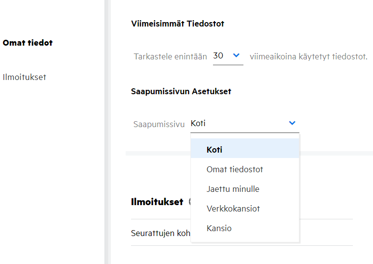 Aloitussivu on oletusarvoinen saapumissivu, ja sitä voi mukauttaa. Voit asettaa Filrin työalueita (paitsi Julkinen-alueen) tai kansioita työalueilla saapumissivuksi. Asetusten muuttamisen jälkeen kirjautuessasi Filriin saapumissivuksi valittu kansio tai työalue avautuu. Näillä ohjeilla voit asettaa saapumissivun asetukset: