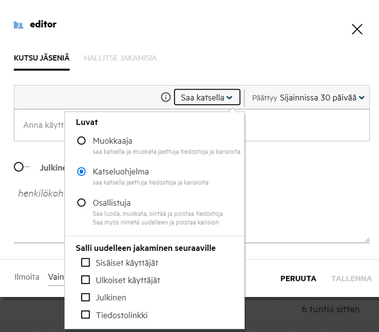Kun useita tiedostoja tai kansioita jaetaan ja yhdellä tiedostolla on Tarkasteluoikeudet ja kansiolla Osallistuja -oikeudet, niin kaikkiin sovelletaan Tarkasteluoikeuksia. Voit muokata jaon oikeuksia käyttämällä Hallitse jakoja -vaihtoehdossa tiedoston Lisää toimintoja -valikosta. Valitse käyttäjä/ryhmä Hallitse jakoa -valintaikkunan Hallitse jakoja -välilehdellä ja napsauta