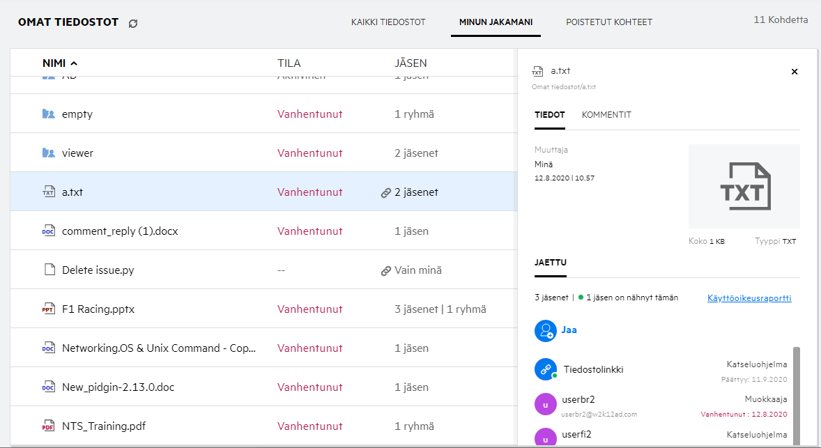 Tiedot käyttäjistä ja ryhmistä näytetään jaon vanhentumistiedon kanssa.