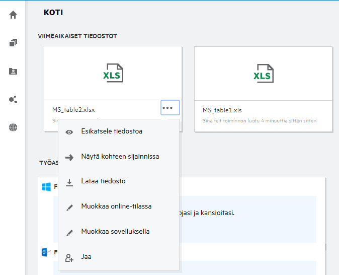 Kuva 8 Viimeisimmät tiedostot -alueen toiminnot