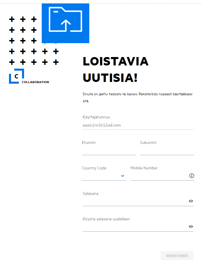 Kun tiedosto jaetaan ulkoisen käyttäjän kanssa, käyttäjän on kirjauduttava Filr-sovellukseen käyttääkseen tiedostoa. Kun tiedosto on jaettu, ulkoiselle käyttäjälle lähetetään sähköposti, joka sisältää linkin itserekisteröintilomakkeeseen. Käyttäjän on rekisteröitävä tiedot lomakkeeseen ja suoritettava itserekisteröintiprosessi loppuun, jotta hän voi kirjautua Filr-sovellukseen. Lomake on alla kuvatun mukainen: