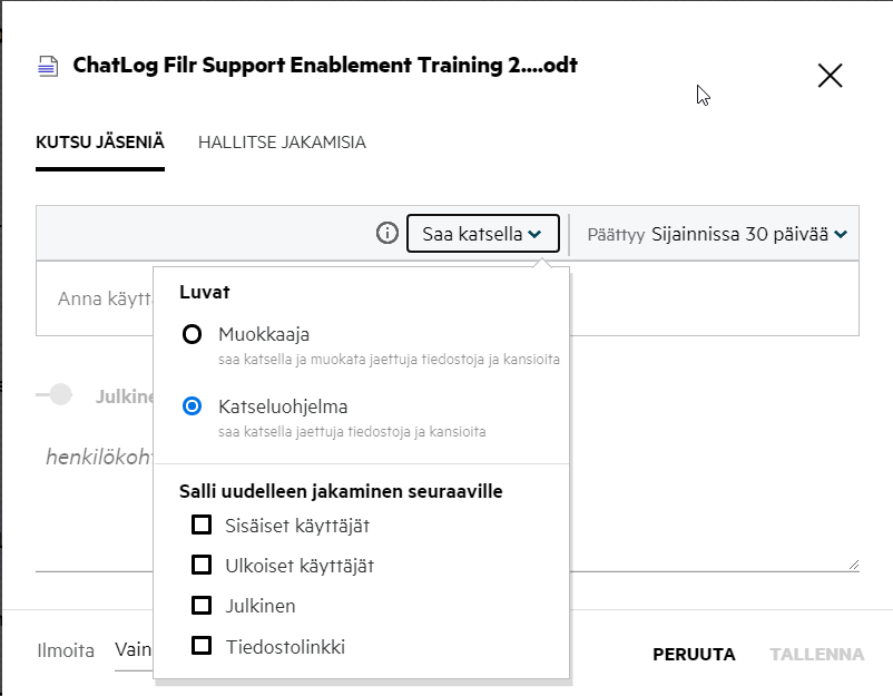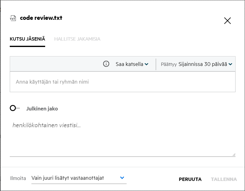 Julkinen: Tiedostosta voi tehdä julkisen.