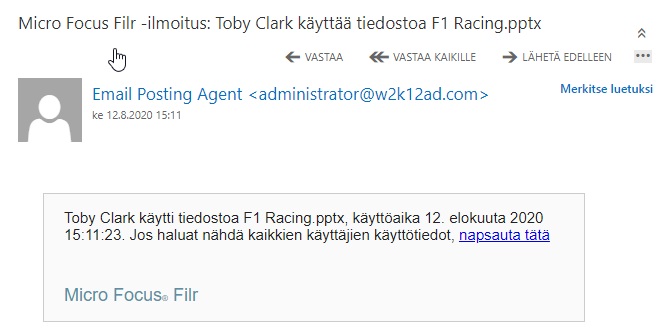 Jaon käyttöoikeusraportti antaa tiedostosta tietoja, kuten kuka on käyttänyt tiedostoa ja milloin, ja onko tiedostolla kommentteja. Jaon käyttöoikeusraportti on saatavilla vain Filr Advanced -tilauksessa. Kun vastaanottaja käyttää jaettua tiedostoa, saat Filristä ilmoituksen sähköpostiisi. Voit myös katsella käyttöoikeusraporttia napsauttamalla sähköpostissa olevaa linkkiä, joka ohjaa sinut vastaanottajan tietoihin. Jos vastaanottaja on käyttänyt jaettua tiedostoa, Käyttöoikeusraportti on saatavilla -vaihtoehto näytetään Lisää toimintoja -valikossa.