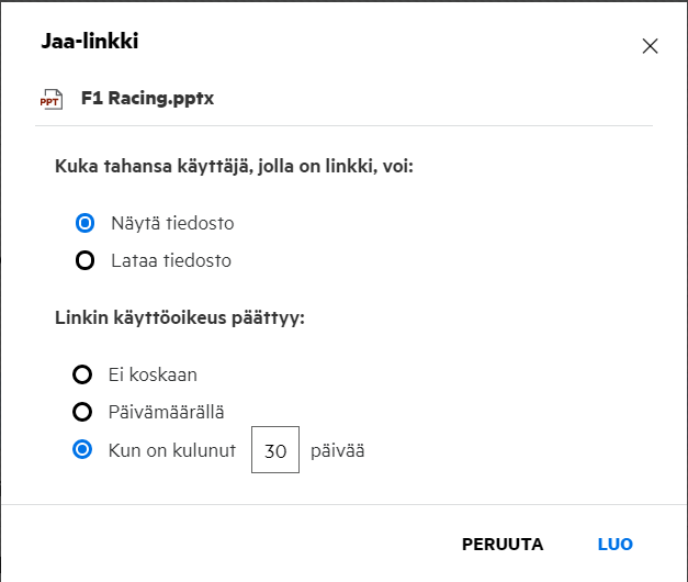Valitse, minkä tyyppisen linkin haluat luoda, ja määritä linkin vanhentumisasetukset. Napsauta LUO.