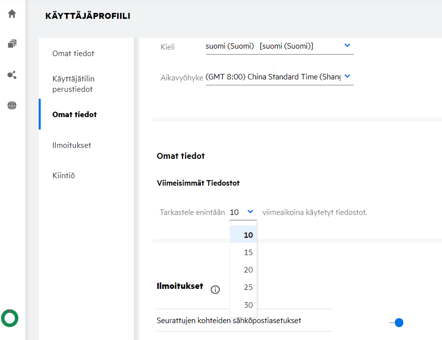 Käyttäjä voi määrittää, kuinka monta tiedostoa Viimeisimmät tiedostot -luettelossa näytetään. Määrittääksesi asetuksen, siirry Käyttäjäprofiiliin.