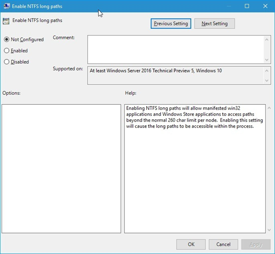 Kliknij dwukrotnie opcję Włącz długie ścieżki NTFS.