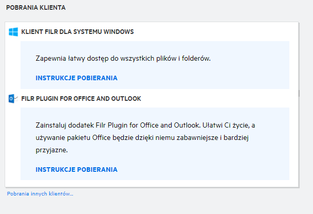 POBRANIA KLIENTA: Informacje na temat rodzimego klienta Filr, łącza pobierania dla innych klientów Filr oraz dodatki typu plug-in do pakietu Office i programu Outlook.