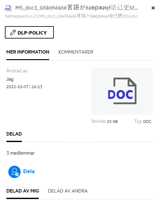 Om DLP är aktiverat och en princip är tillämpad på nätmappsnivå visas DLP-principnamnet ovanför fliken Information. Principnamnet är skrivskyddat och kan inte redigeras.