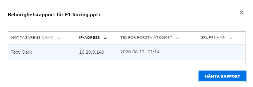 Rapporten innehåller åtkomstinformation för mottagarna, däribland vem som har använt filen, IP-adressen för den dator som filen användes med samt datum och tid för filåtkomsten. Du kan hämta en PDF-version av rapporten genom att klicka på Hämta rapport.