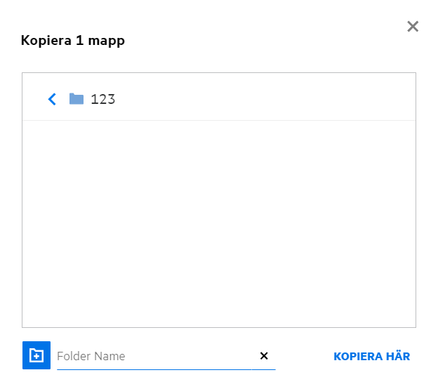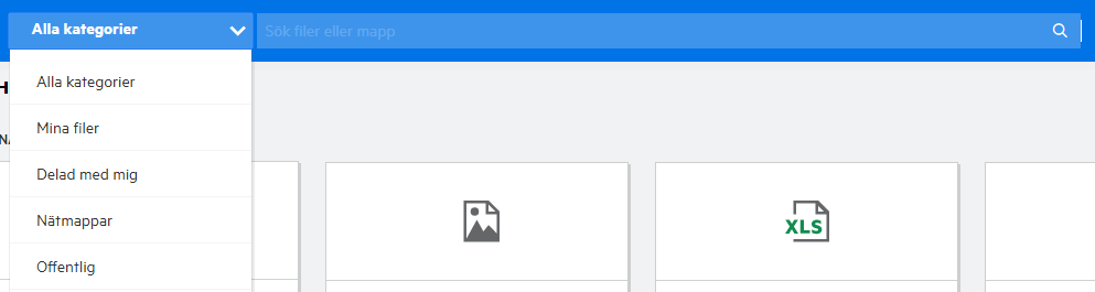 När du väljer Mapp visas fältet Sökmappar. Ange mappnamnet eller de första tre tecknen i mappnamnet. Alla mappar med mappnamn som matchar den angivna strängen i sökfältet visas så att du kan välja dem. Mapparna från alla de Filr-arbetsområden som du har åtkomst till (Mina filer, Delad med mig samt Nätmappar) visas. Hovra över mappnamnet om du vill se den exakta sökvägen till mappen.