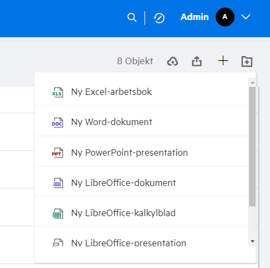 Nu kan du redigera de anpassade mallarna eller skapa en ny fil i Filr. Alternativet Skapa ny fil är endast tillgängligt för Advanced Filr Edition, och Innehållsredigeraren måste vara aktiverad av administratören. I området Mina filer och Nätmappar finns det här alternativet på rotnivå och mappnivå. I områdena Delad med mig och Delad av mig finns alternativet bara på mappnivå.