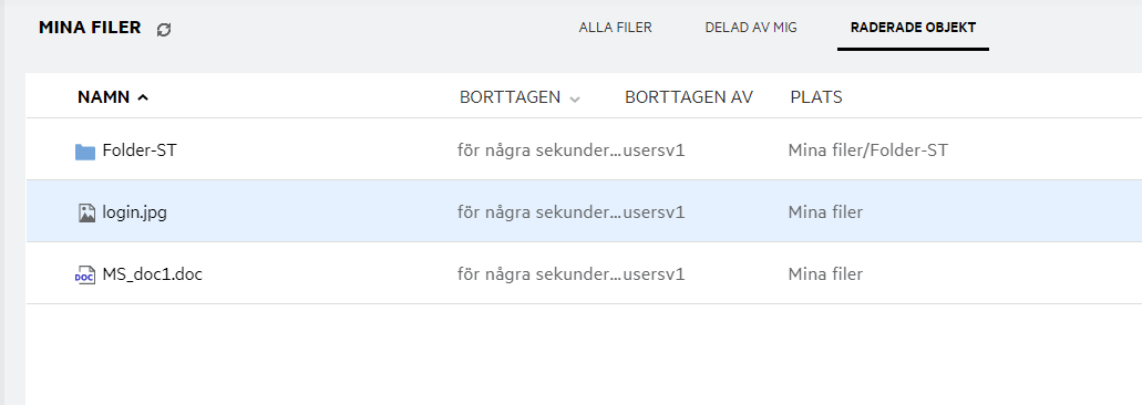 Här visas filer eller mappar som du har tagit bort. I Filr kan du hämta filer och mappar från papperskorgen och återställa dem till de tidigare platserna. När du återställer en fil återställs även alla tillhörande kommentarer.