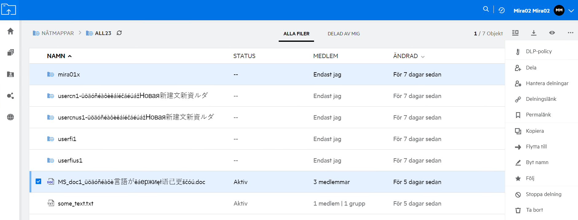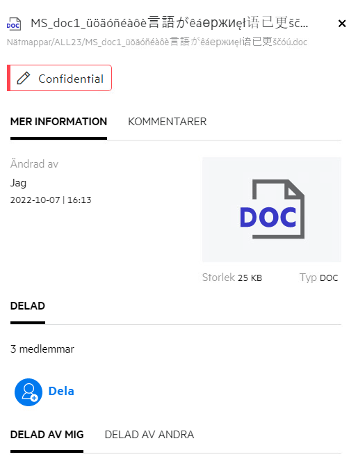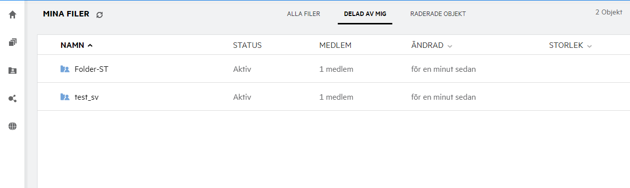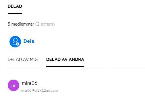 Vid delning av en fil uppdateras kolumnen Medlemmar i området för Mina filermed det antal medlemmar eller grupper som filen delas med. Alla filer som du delar visas dessutom i DELAD AV MIG i respektive områden. Om det finns filer som delas med dig visas de filerna i området för DELAD MED MIG. Du kan även klicka på knappen
