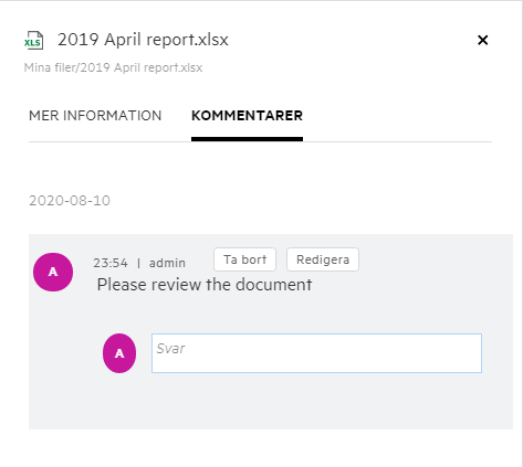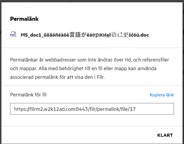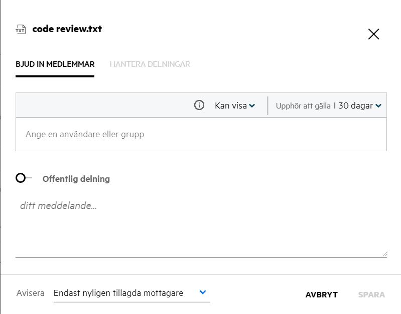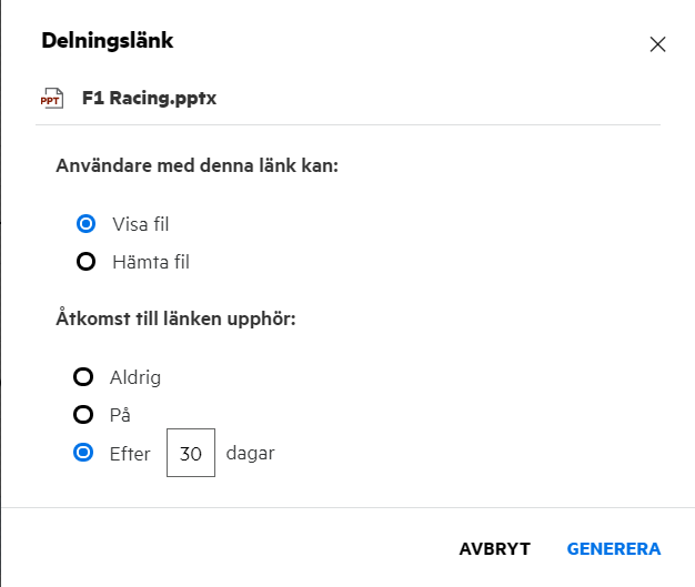 Delningslänk: Filen kan omdelas med hjälp av delningslänken.