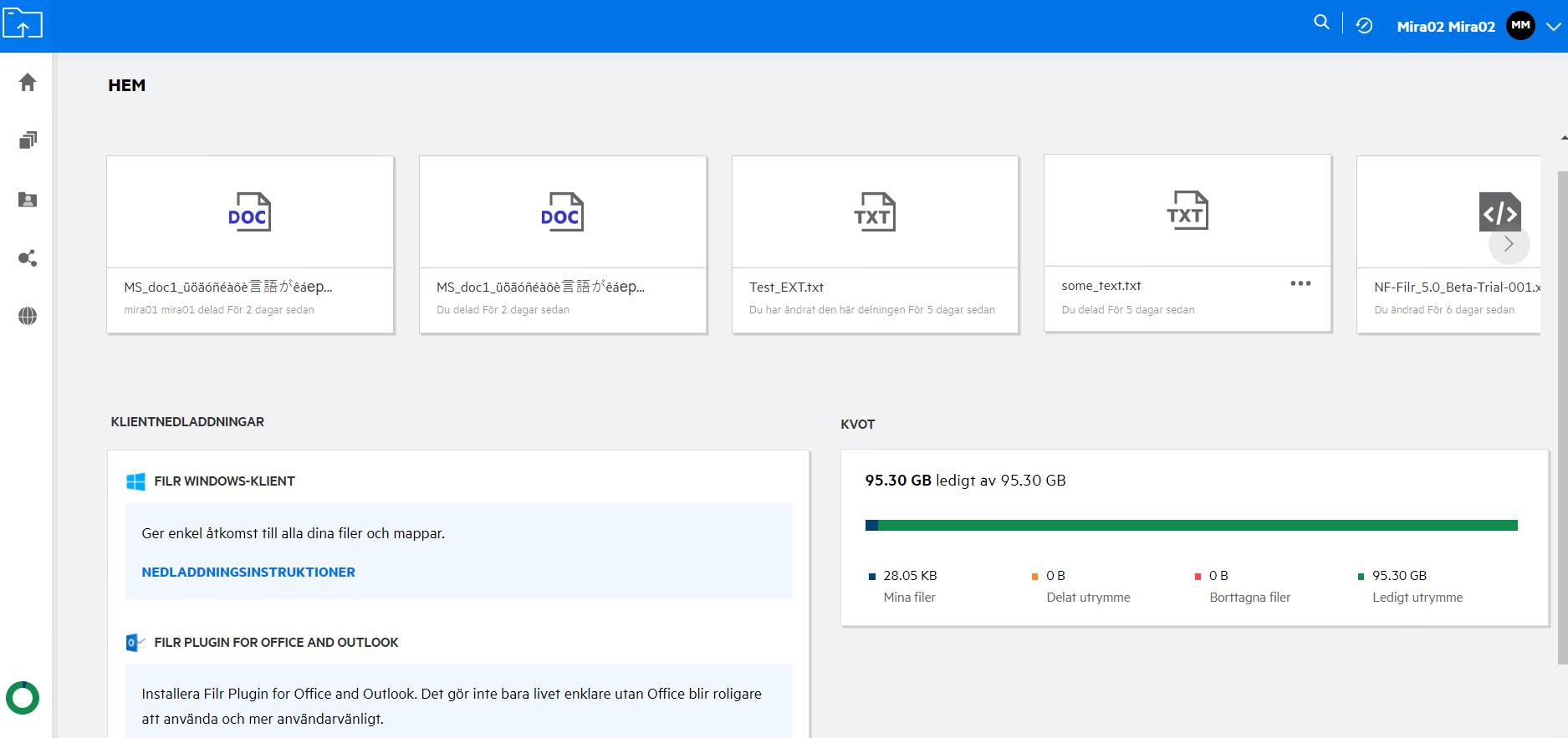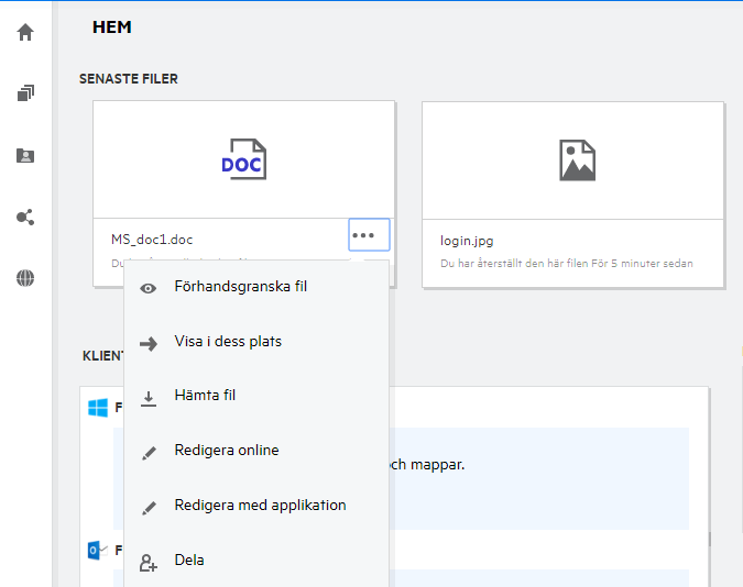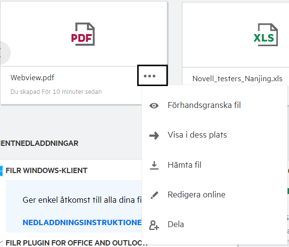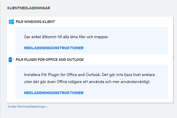 KLIENTHÄMTNINGAR: Information om den inbyggda Filr-klienten, hämtningslänkar till andra Filr-klienter samt plugin-program för Office och Outlook.