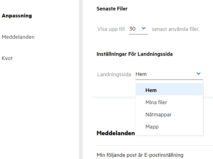 Som standard är sidan Start landningssida, men du kan anpassa den. Du kan använda Filr-arbetsområden (förutom Offentligt) eller mappar i arbetsområdena som landningssida. När du loggar in i Filr efter konfiguration kommer du till den mapp eller det arbetsområde som har angetts som landningssida. Så här ställer du in en annan landningssida: