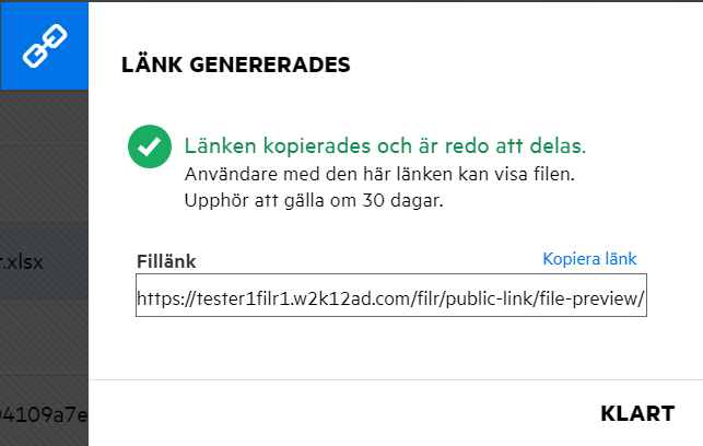 Länken skapas och kopieras automatiskt till Urklipp. Nu kan du dela länken direkt med valfria mottagare via e-post, SMS, sociala medier eller andra samarbetsplattformar. Användare som klickar på länken får direkt åtkomst till filen. Beroende på typen av länken kan användare visa eller hämta filen.