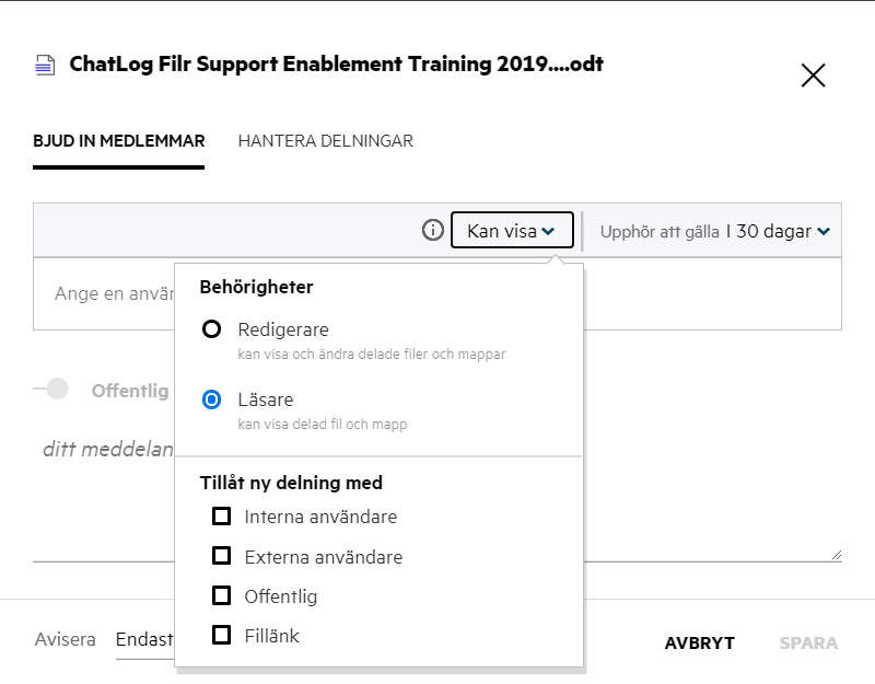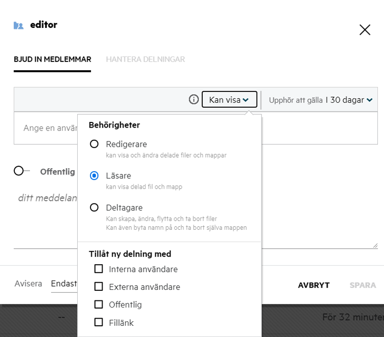 När du delar flera filer eller mappar och en fil har behörigheten läsare och en mapp har behörigheten deltagare så gäller behörigheten läsare. Du kan redigera delningsbehörigheterna med hjälp av alternativet Hantera delningar i menyn Fler åtgärderför en fil. I dialogrutan Hantera delning går du till fliken Hantera delningar, markerar namnet på användaren/gruppen och klickar på