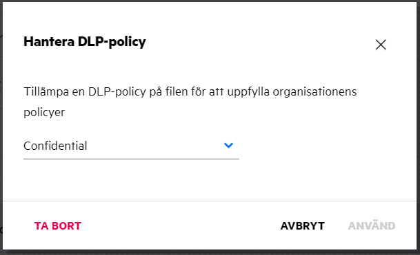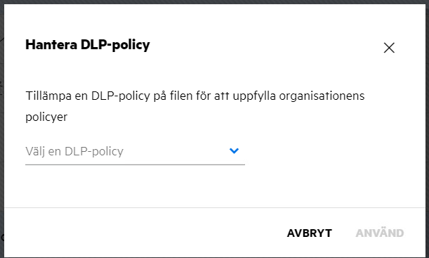 Om DLP är aktiverat och en princip inte är tillämpad på nätmappsnivå visas knappen DLP-princip ovanför fliken Information. Du kan klicka på den här knappen, välja en princip och tillämpa den på filen.