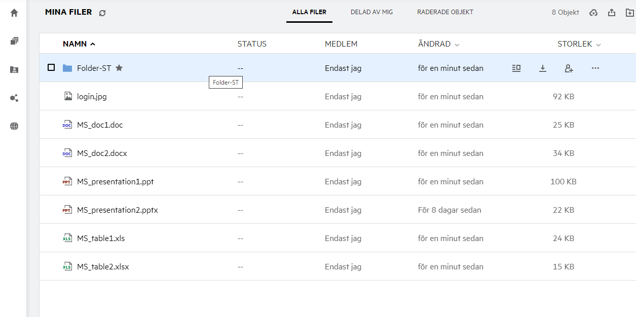 Alla dina personliga filer och mappar är tillgängliga på en och samma plats. De objekt som du har överfört till Filr eller som delas av dig visas i detta avsnitt.