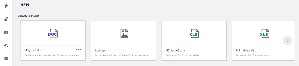 I Senaste filer kan den inloggade användaren se de filer som har använts nyligen. När filer delas kan bara filens ägare samt mottagaren se dem i listan med senaste filer. Användare A (ägaren) delar till exempel en fil med användare B. Filen visas i listan med senaste filer för användare A och användare B. Om samma fil delas av användare A till användare C efter några dagar visas den delade filen i listan med senaste filer för användare A och användare C.
