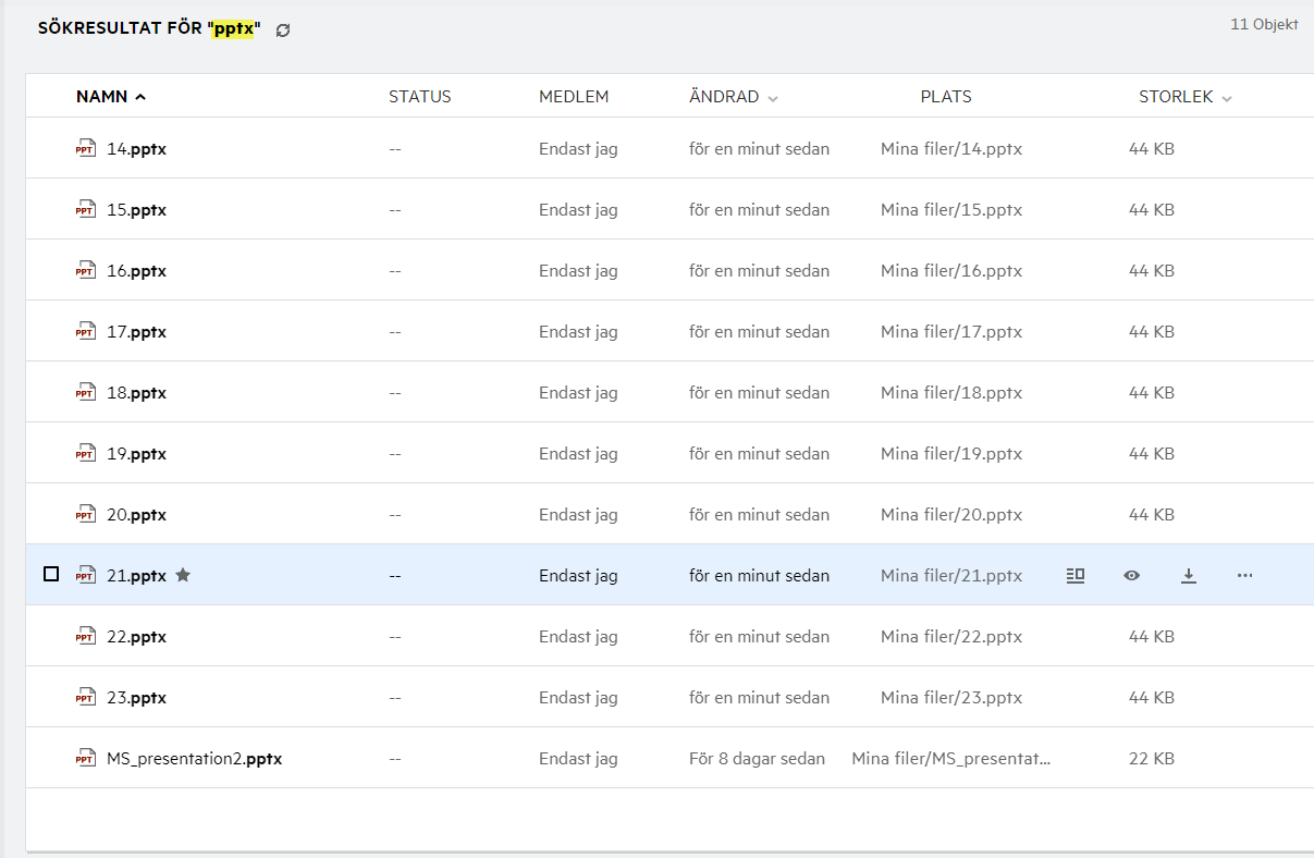 Området för Mina filer (Alla filer och Delad av mig) och Nätmappar omfattar följande kolumner: